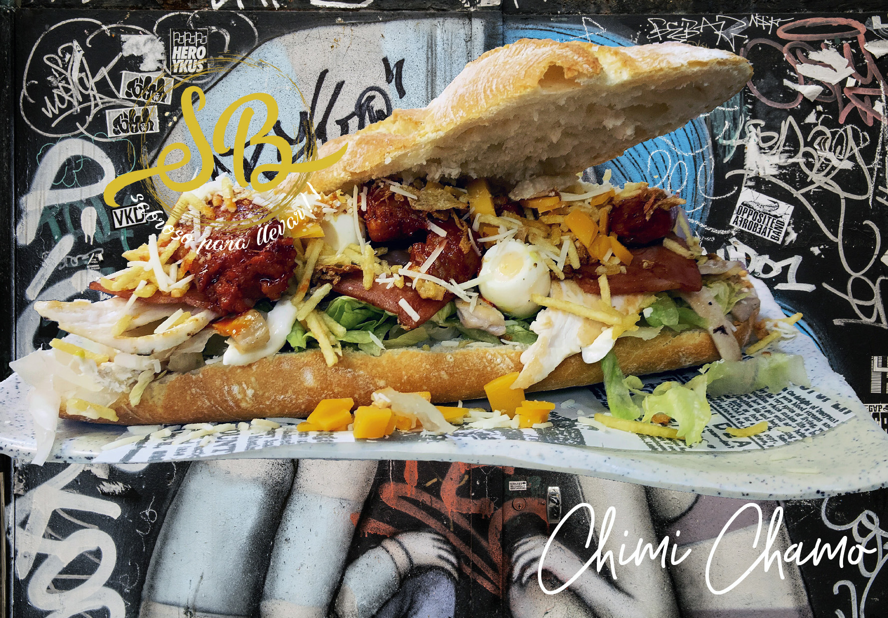 (Ensalada de la casa, cebolla frita, pollo, papa pipe, chorizo, lomo parrilla, bacón, queso rayado cheddar, huevo de codorniz, maíz, ketchup, mayonesa, mostaza y lluvia de queso)