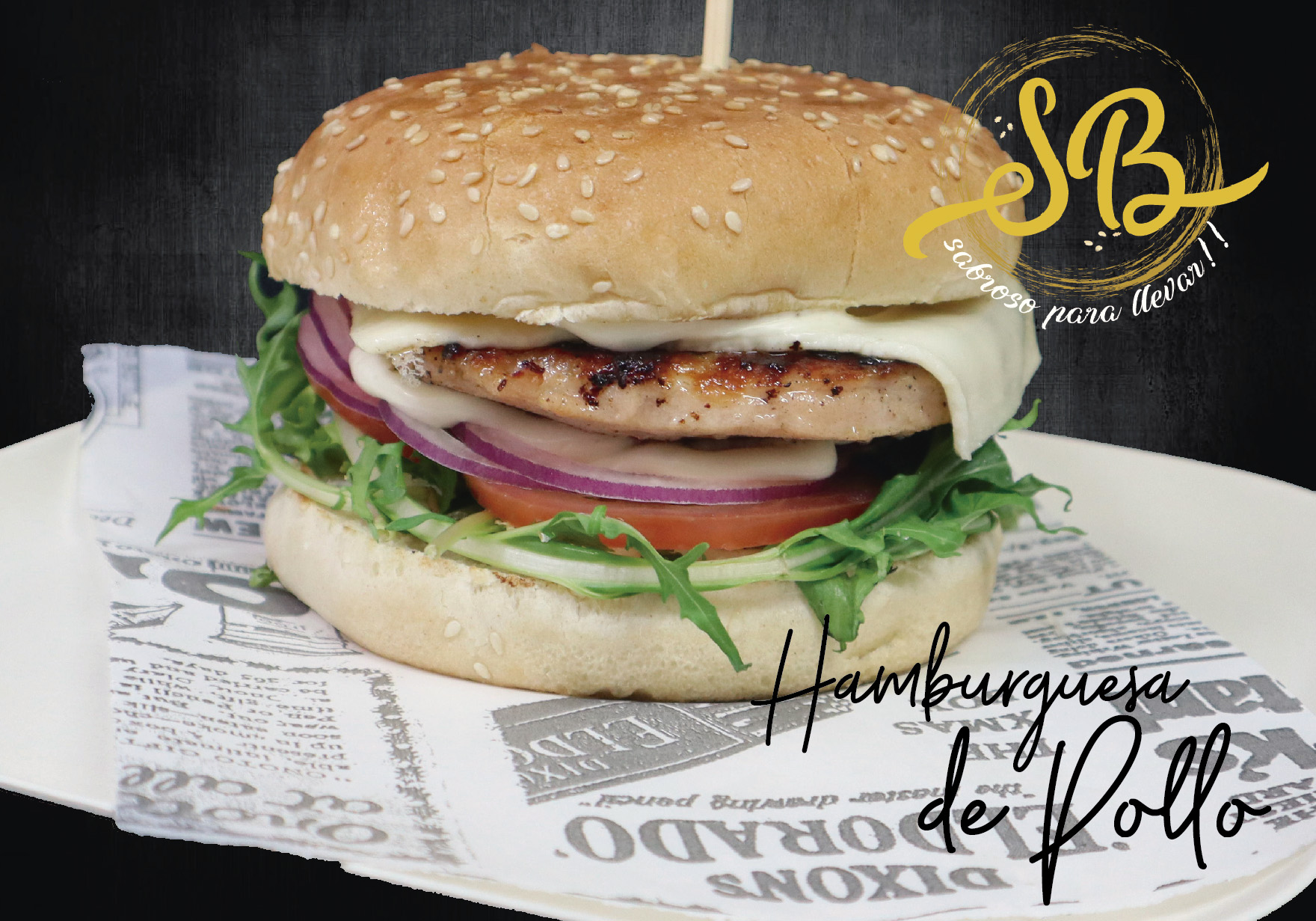 Hamburguesa de pollo, queso, lechuga, tomate, cebolla roja, pepinillos y mahonesa.