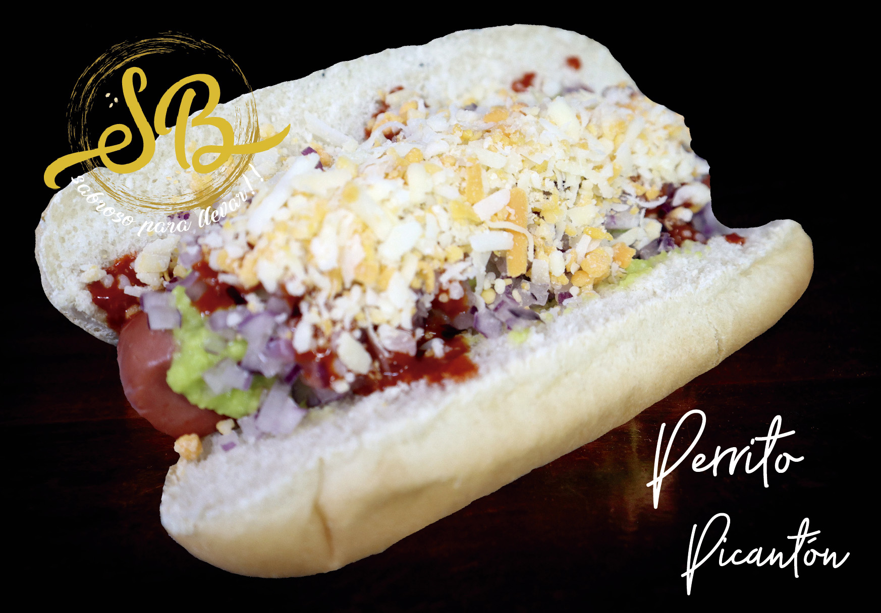 Salchicha, guacamole, queso rallado, s. picante y cebolla roja.