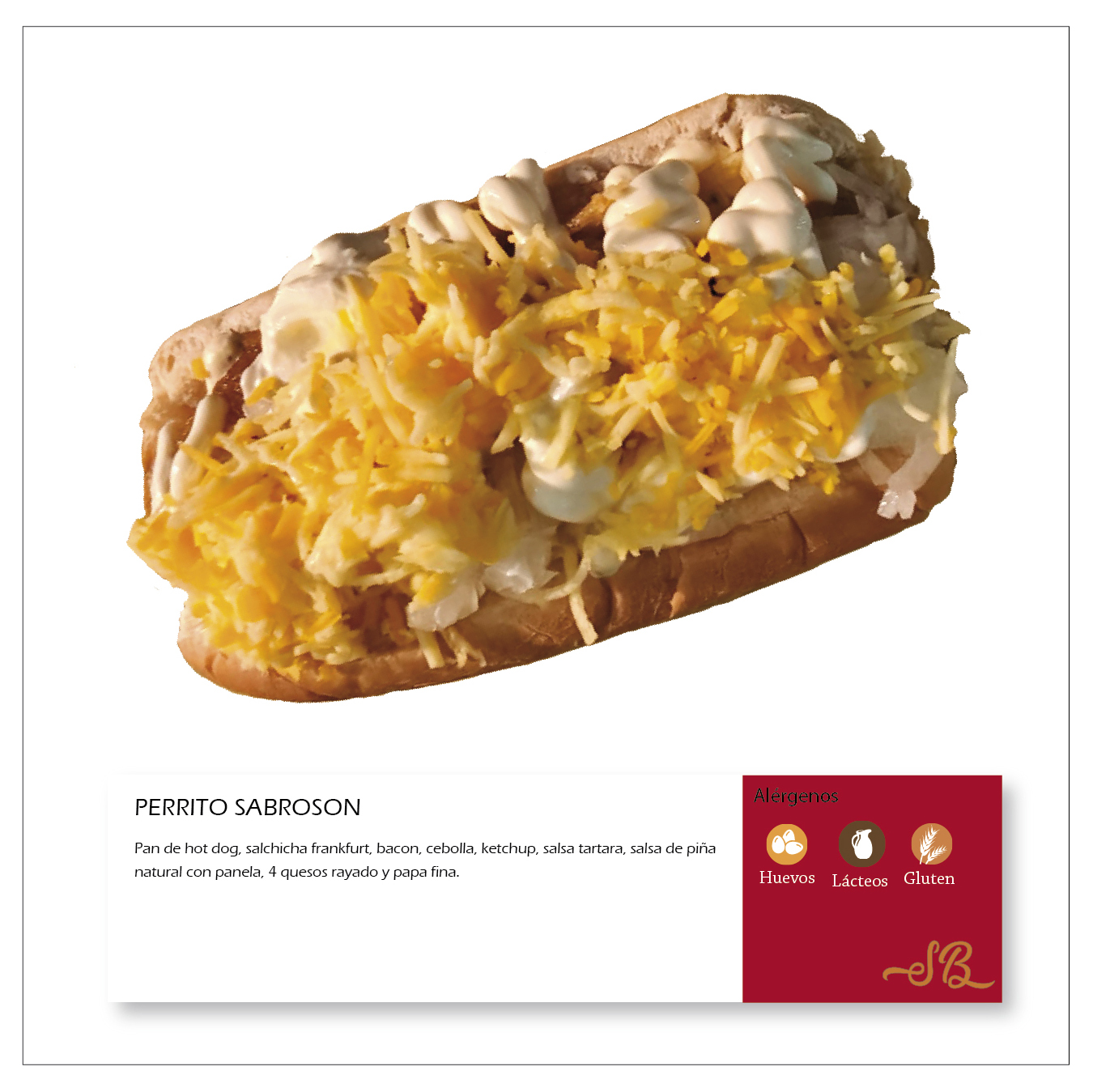 Salchicha, beicon, papa frita, queso rallado, piña, cebolla, mahonesa, ketchup y tartara.