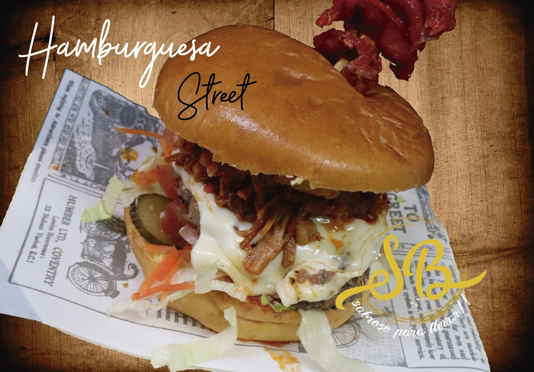 Carne vacuna 150gr., queso gouden, pepinillo,carne mechada, ensalada, aros de cebolla y salsa chimichurri, en pan brioche pinchada con chorizo.